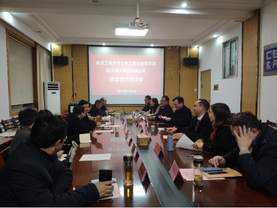 (通讯员杜智)2022年1月4日下午,在武昌校区永兴集团新入口会议室,武汉工程大学党委常委、科学技术发展院院长吴云韬、永兴集团新入口党委书记陆新、院长陈旭勇接待了来校访问交流的武穴市人民政府副市长田琦峰、胜宇建设集团有限公司董事长张学义等一行八人,校企双方就如何加强校企合作,充分利用双方优势,提高高校服务社会服务地方经济建设能力,加快企业专业紧缺人才培养,达到校企双赢等问题进行了广泛交流和洽谈,双方初步达成了合作共识。参加交流座谈的有科学技术发展院副院长季家友,副院长吴巧云、院长助理边晓亚、工会主席张哨军等。座谈会由永兴集团新入口党委副书记成轶主持。